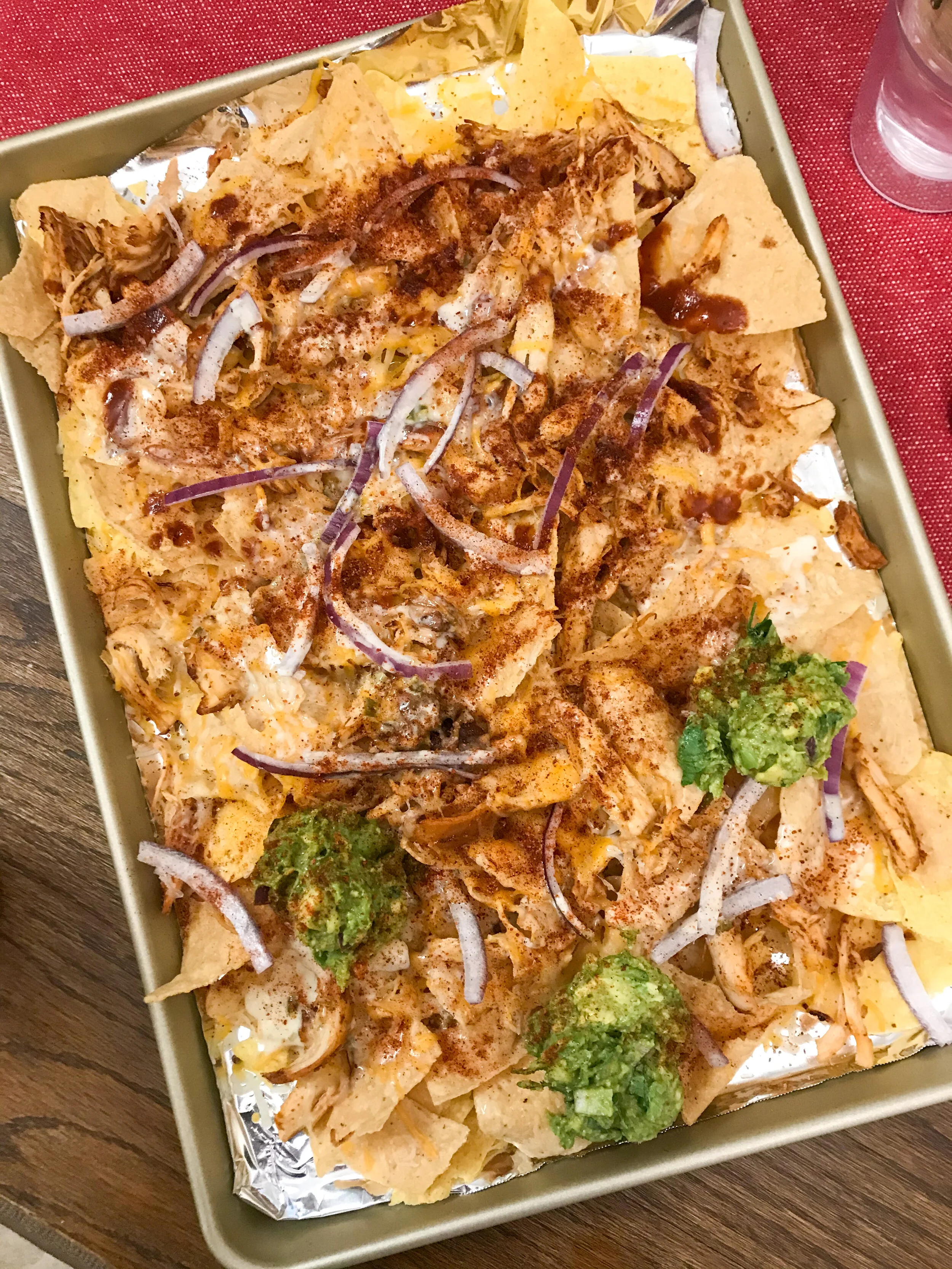 Remove from the oven and top with remaining desired toppings— I used extra thinly sliced onions and scoops of fresh guacamole (Optional: Mix together avocados, garlic, lime juice, cilantro, chopped red onion, and salt. Add more seasonings as desired).